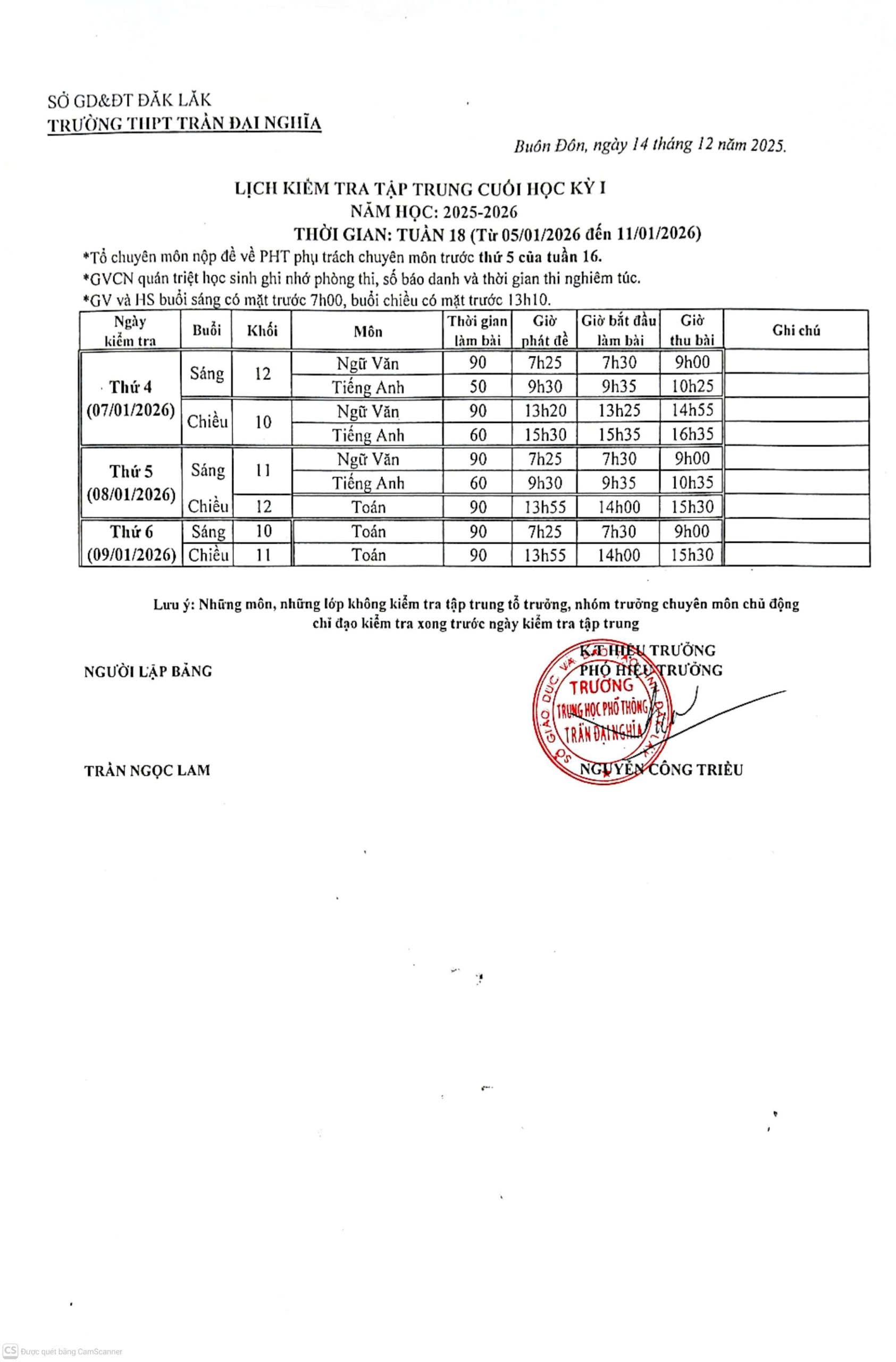 Trường THPT Trần Đại Nghĩa thông báo kế hoạch kiểm tra tập trung học kì 1, năm học 2025-2026.